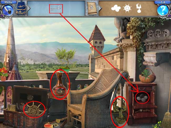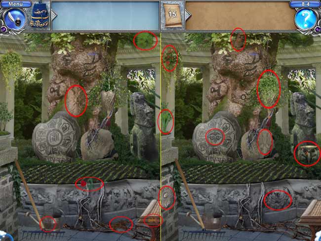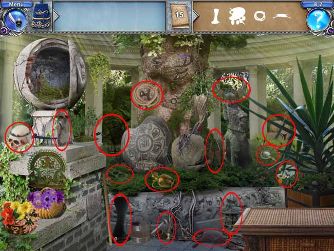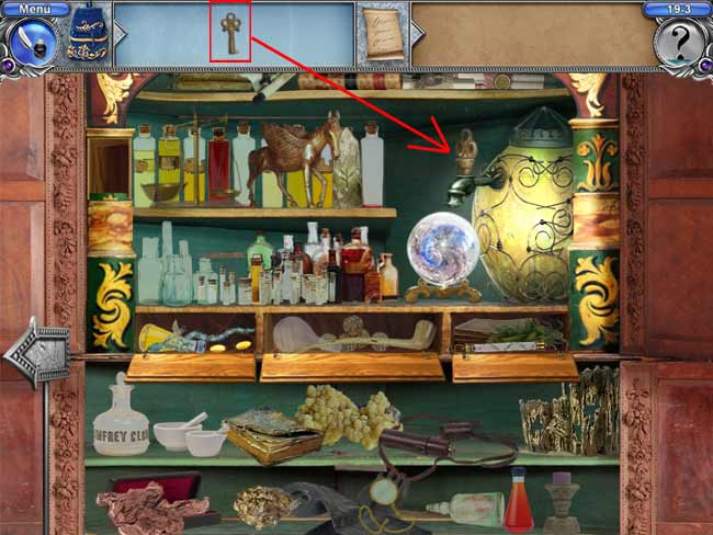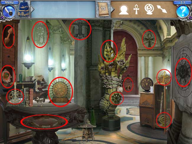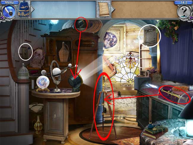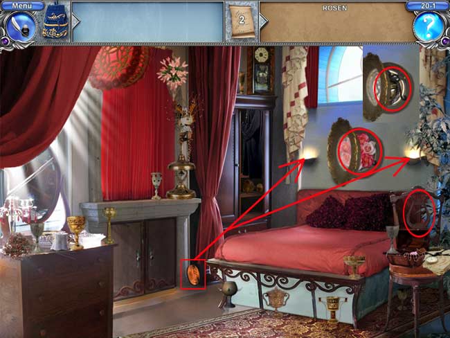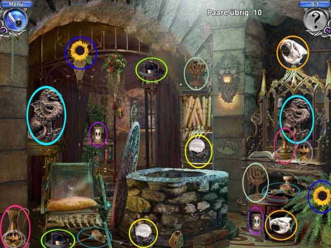• Manche Objekte verstecken sich hinter anderen, so dass du sie erst finden kannst, wenn du das andere Objekt entfernt hast. Oft musst du auch erst Türen, Vorhänge, Geheimfächer oder sonstige Dinge öffnen, bevor du alle Objekte finden kannst.