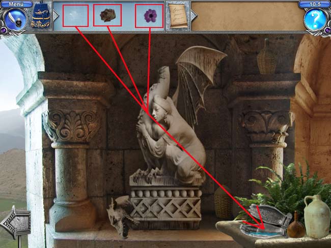 • Klicke vorne die Ranken, das Fach unter der Kamelstatue und die bunte Scheibe an.
