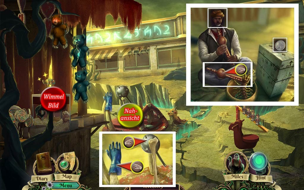 Fortgeschrittene Spieler: Der Tipp und die Überspring-Funktion laden sich langsamer auf. Aktive Bereiche glitzern nicht, jedoch die Wimmelbilder. Es gibt Strafen für Fehlklicks und Bereiche, an denen es etwas zu erledigen gibt, werden auf der Karte angezeigt.