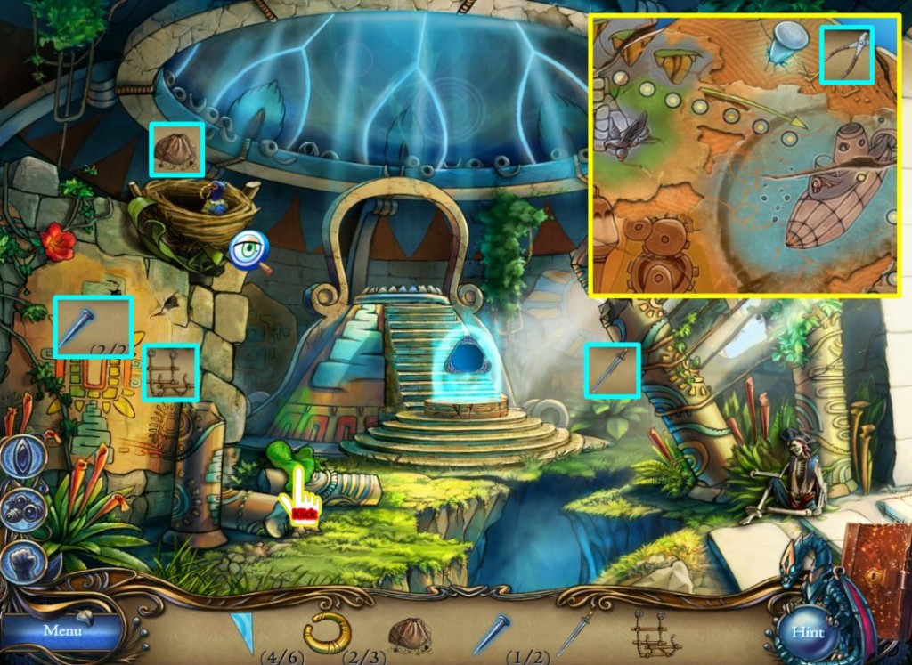 Unten in der Mitte befindet sich das Inventar, es ist ständig sichtbar. Rechts daneben liegen der Hinweis-Knopf und die Karte, links gibt es Zugang zum Menü.