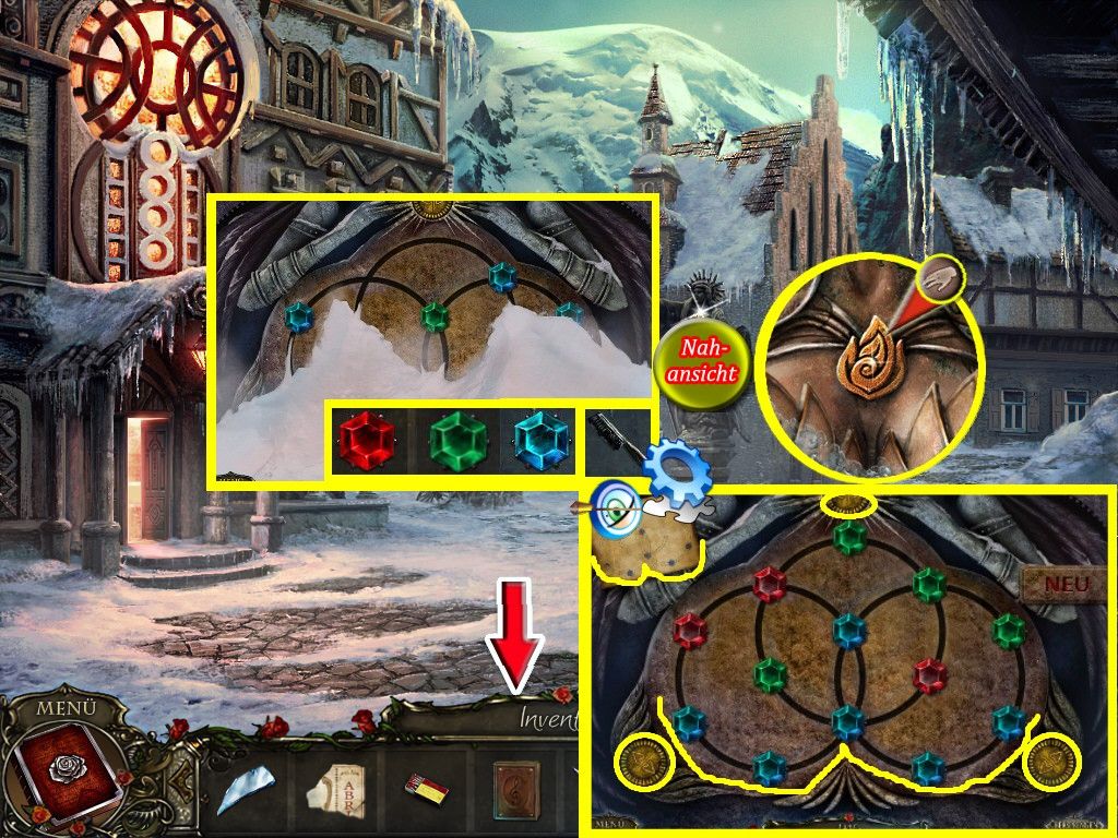 - Dritte Lösung: Eisherz 8x hinunter - Rose 2x hinauf - Schneeflocke 3x hinunter - Eiskrone 3x hinauf - Rose 2x hinunter - Eiskrone 6x hinauf - Schneeflocke 3x hinunter Eisherz - 2x hinauf.