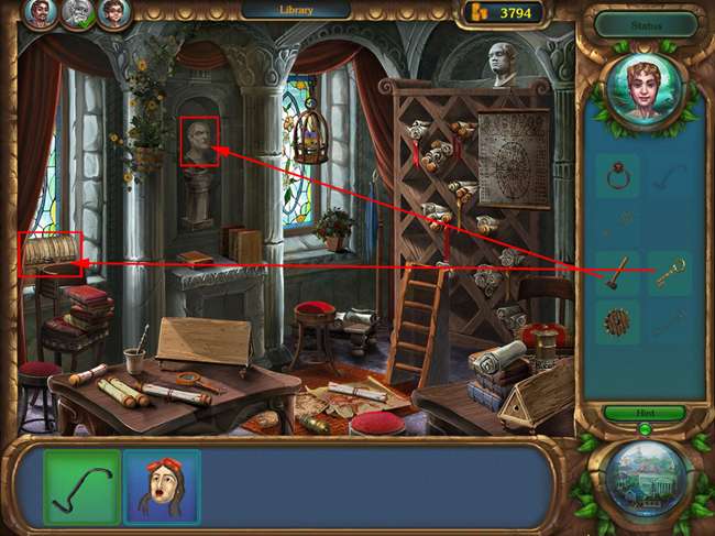 - Öffne mit dem Ast die Dachluke und nimm den Schlüssel sowie die Statuette heraus.
