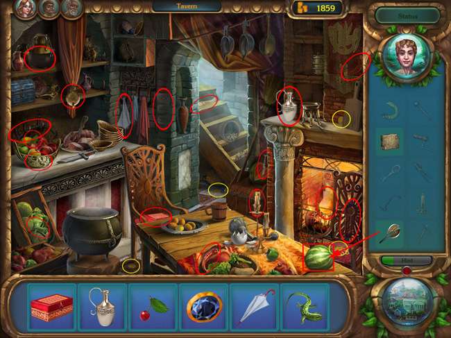 - Suche immer erst alle angezeigten Objekte, soweit es geht, bevor du Inventarobjekte einsetzt. Sonst kann es passieren, dass du einen dadurch gefundenen Gegenstand noch nicht einsammeln kannst.