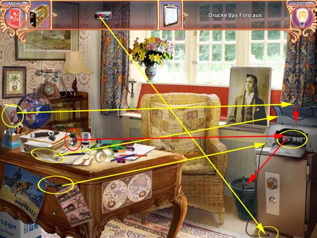 - Links daneben ist ein Notizblock, darauf ist die Anzahl der zu findenden Objekte angezeigt.
