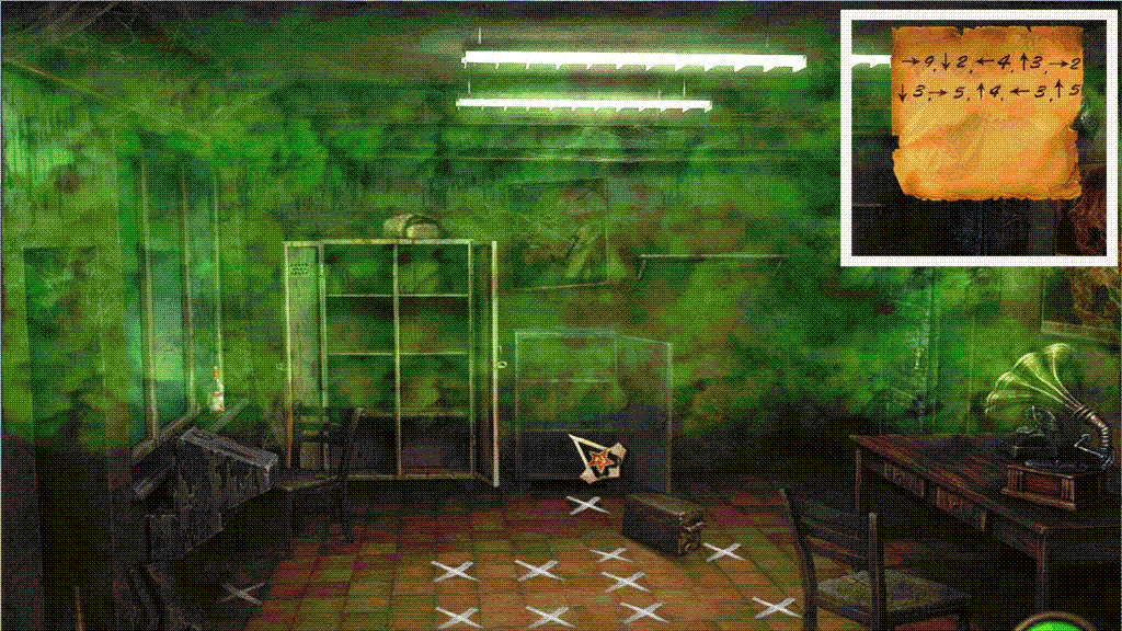 - Schau auf den Schreibtisch, setze die Verschlüsselungsplatten - 2 - 5 - 3 - 4 - 1 von oben nach unten auf das Chiffrebild, nimm den Code für den Tresor.