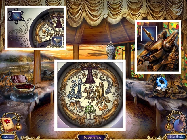 - Klicke die Uhr hinten für ein Wimmelbild an. für den Gegenstand "Zahnrad" nimm die Schaufel (Spoiler 62) aus dem Inventar und grabe das Zahnrad unten rechts aus. Wenn Du alle Gegenstände gefunden hast, erhältst Du ein Queue.